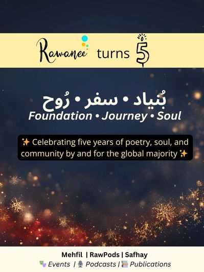 This year, Rawanee celebrates five years of creative authenticity with بُنیاد • سفر • رُوح — Bunyād • Safar • Rūḥ (Foundation • Journey • Soul): a season of events, publications, and podcasts honouring the voices, stories, and languages, that have and continue to shape our community.